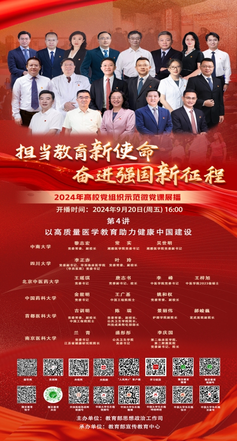 近日,2024年高校党组织示范微党课《担当教育新使命,奋进强国新征程》第4讲《以高质量医学教育助力健康中国建设》上线播出。 2024年高校党组织示范微党课展播活动由教育部思想政治工作司主办,教育部宣传教育中心承办。