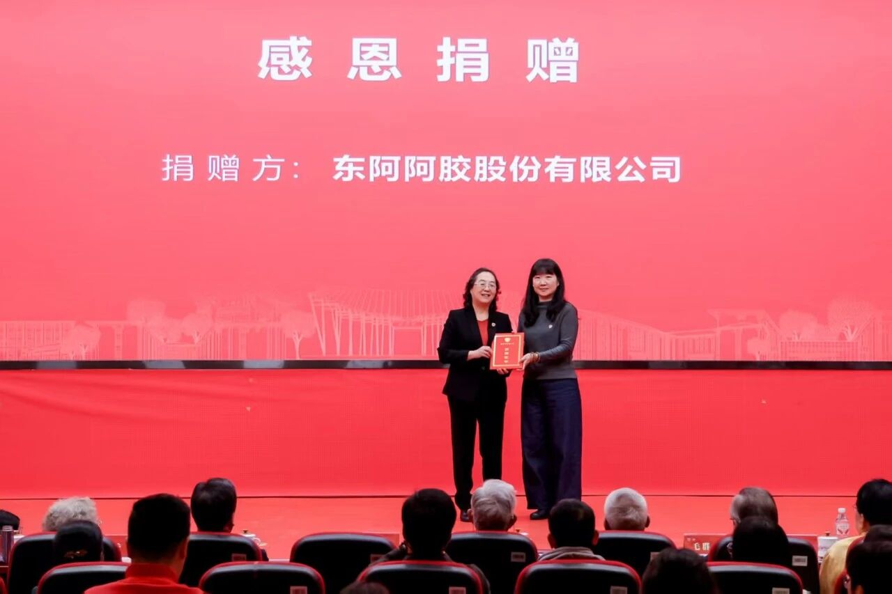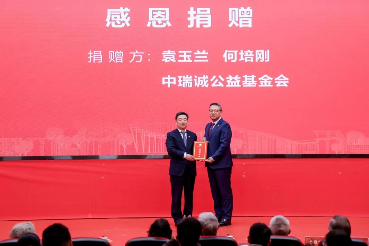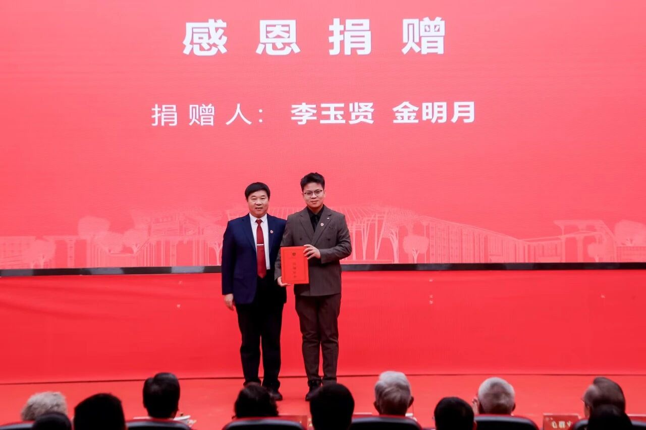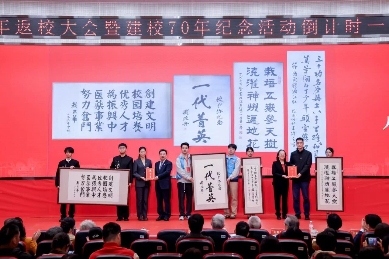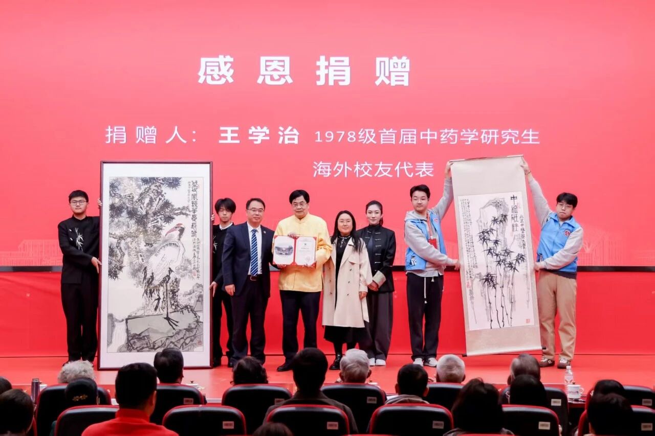 为表达对母校的感恩之情,1996级中医学专业博士校友、东阿阿胶股份有限公司高级技术专家宋冰代表公司,管理学院已故退休教师袁玉兰之子何源泉、1976级中医学院校友李玉贤和金明月夫妇之孙李韦枢分别代表母亲和祖父母,向母校捐赠资金;1978级首届中药学研究生、海外校友王学治,向母校捐赠精心创作的2幅国画作品《盛世风韵》《中流砥柱》;1993级中药专业校友丁锐向母校捐赠刘渡舟、王绵之、颜正华、贾维胜四位国医大家留下的4幅墨宝。王瑶琪书记、唐志书校长、闫振凡副校长、刘永琦校长助理上台接受捐赠,并为捐赠校友颁发捐赠证书。