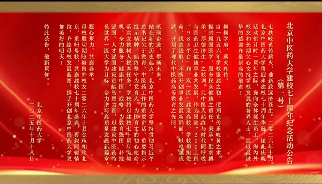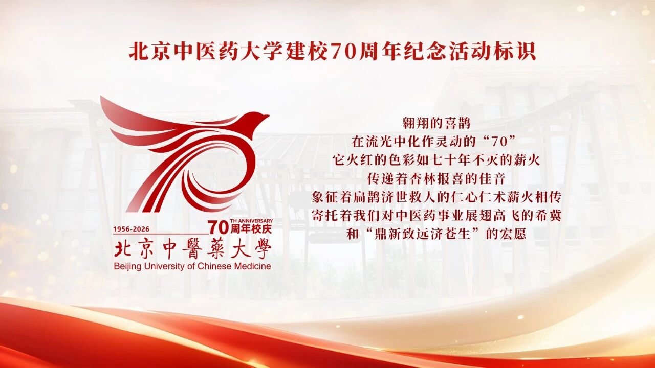 随后,建校70周年纪念活动标识(LOGO)和第一号公告正式发布。动画中翱翔的喜鹊在流光中化作灵动的“70”,它火红的色彩如七十年不灭的薪火,传递着杏林报喜的佳音,象征着扁鹊济世救人的仁心仁术薪火相传,寄托着对中医药事业展翅高飞的希冀和“鼎新致远济苍生”的宏愿。