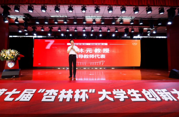中药学院王林元教授作为指导教师代表发言,他从项目评审角度出发,对项目进行精彩点评,高度评价学校创新创业教育成果,对参赛团队参与高级别比赛的技巧和注意事项提出中肯意见和建议。