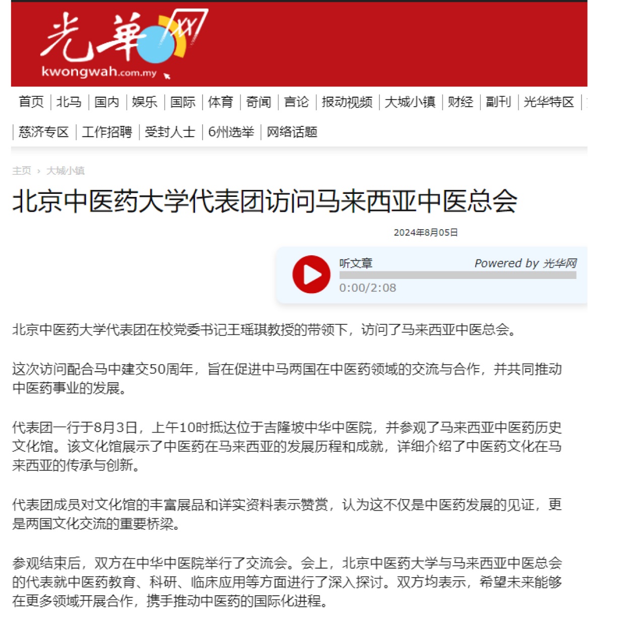 2024年是中马建交50周年、中马友好年,中国同马来西亚是千年结好的邻居、以心相交的朋友、合作共赢的伙伴。本次访问马来西亚旨在赓续友谊,开拓中医药教育领域新合作。马来西亚访问期间,王瑶琪书记访问马来西亚卫生部传统与辅助医药管理局,与吴清顺局长会谈,就中医药学历教育、专科培训、科学研究、健康服务等领域交流探讨。参访马来西亚马来亚大学、UCSI附属医院、马来西亚中医总会、马来西亚留华同学会、IJM集团,并与马来西亚校友会亲切座谈。期间到访驻马来西亚使馆,与赵长涛参赞就中医药教育发展历史和前景进行充分交流。万象城allwincity官网校友、马来西亚杰出青年张家玄共同参加相关机构访问。