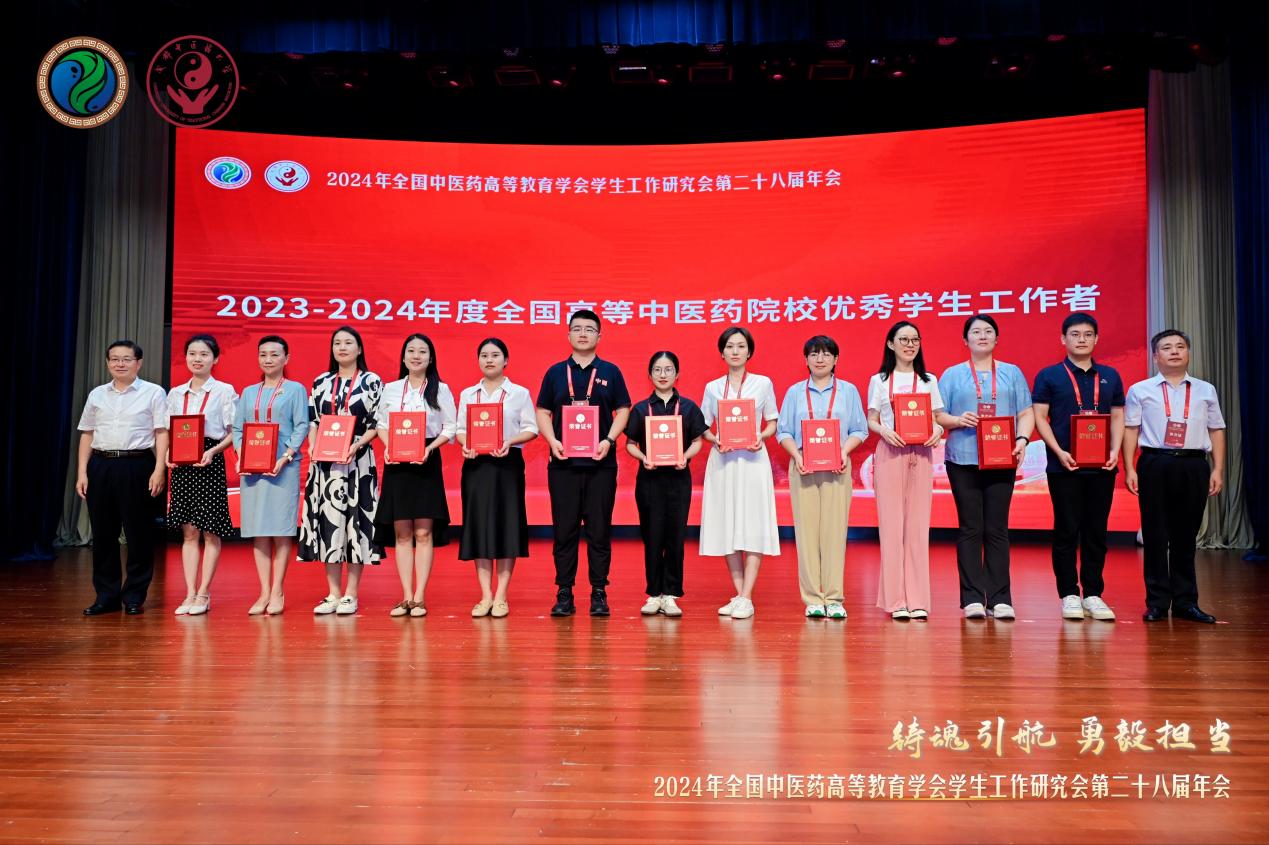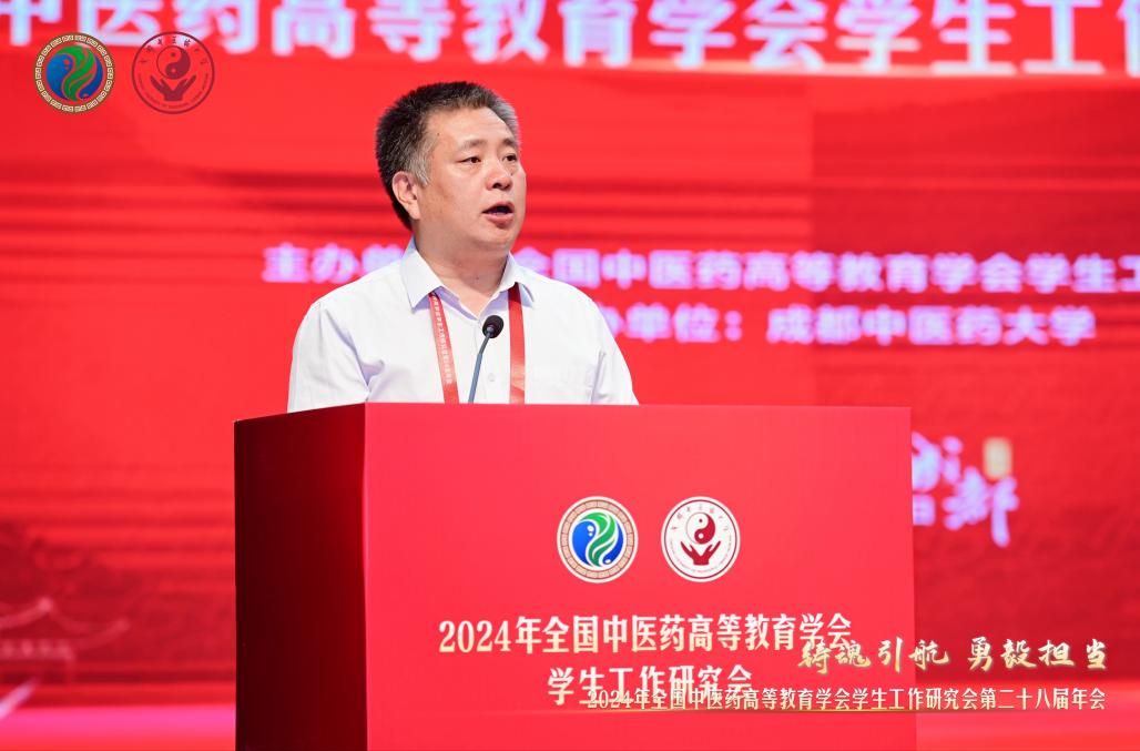 开幕式上,成都中医药大学党委书记刘毅致辞,四川省教育厅党组成员、副厅长丁念友讲话。全国中医药高等教育学会学生工作研究会秘书长、万象城学生工作部部长赵建磊在开幕式宣读了2023-2024年度优秀辅导员、优秀学生工作者以及10项学生思想政治教育特色成果奖获奖者表彰决定,以及2024年学生工作研究会科研项目中标名单及科研结题意见。万象城4位辅导员荣获全国中医药高等院校“优秀辅导员”称号,4位学生工作者被评为全国中医药高等院校“优秀学生工作者”,万象城申报的《“3×3”模式的思政网络实践育人矩阵构建》被评为全国中医药高等院校学生思想政治教育特色成果奖。同时有4位老师申报的课题获得年会课题立项。