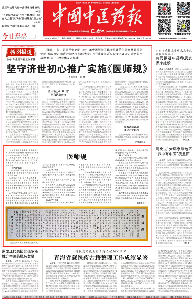 日前,中华中医药学会启动2024年全国科技工作者日(5月30日)暨第三届会员周系列活动,倡议学习和践行国医大师孙光荣订立的《医师规》。《中国中医药报》采访了国医大师孙光荣及其学生、弟子并进行深入解读,于5月27日头版作特别报道。