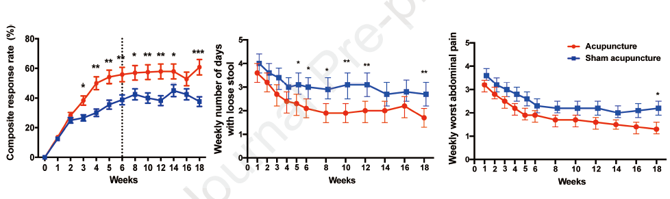 该试验在中国6家三甲医院开展,共纳入了280例符合罗马IV诊断标准的18-75岁腹泻型肠易激综合征患者,以1:1的比例随机分配至针刺组或假针组(非穴位使用钝头针),治疗周期为6周,共15次治疗,并进行12周的随访。主要结局指标是第6周的复合应答率(定义为在第6周内,最严重腹痛平均评分较基线改善至少30%,且腹泻天数较基线减少50%或以上)。