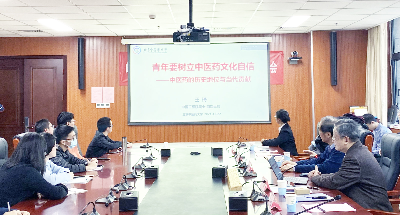 王琦院士做了《青年要树立中医药文化自信——中医药的历史地位与当代贡献》的专题报告。报告从中医药在人类文明的地位、中医药对人类健康的贡献、中医药在“一带一路”中的作用三个方面系统阐述了中医药的历史和当代价值。王琦院士表示,中医药是中华传统文化的优秀代表,也是铸牢中华民族共同体意识的宝贵资源。当今中华文化复兴,东西方文化交流、互补将是发展之大趋势。民族文化是培养民族精神的土壤,是民族之魂栖息的精神家园,是民族凝聚力、创造力的不竭源泉。要增强民族自信与文化自信,解构现代中医药发展新势能、新动能,走智慧中医药产业化道路,将中医药学与人工智能、大数据、互联网融合,服务人类健康,加速中医药融入国际体系,让中医药成为民心相通的健康使者。