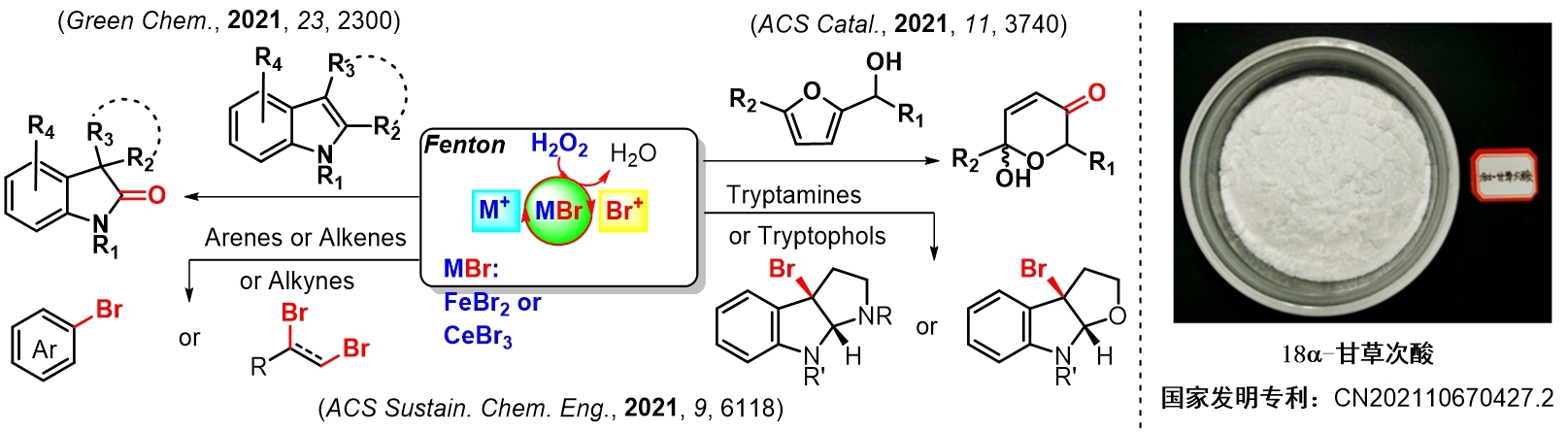 芬顿反应是一种极为绿色且廉价的氧化体系,但由于选择性较差,目前主要局限于污水处理领域。如能提高反应选择性,使其广泛应用于高活性、昂贵、稀缺中药单体的规模化制备,必将产生巨大的产业和学术价值。近期,中药学院赵国栋特聘副教授(C类引进人才,2021北京市科技新星)联合香港科技大学童荣标教授,利用协同催化策略,使选择性差的羟基自由基通过“离子-自由基”紧密相互作用优先与卤负离子反应,并将原位生成的卤正离子进一步应用于氧化、重排和溴代等反应(详见下图)。相关成果发表于美国化学会主办期刊:ACS Catalysis(Q1区,IF 13.1),ACS Sustainable Chemistry & Engineering(Q1区,IF 8.2)和英国皇家化学会主办期刊:Green Chemistry(Q1区,IF 10.2),赵国栋特聘副教授为第一作者,万象城allwincity官网为第一单位。该策略即提高了芬顿化学的选择性,也为“精准中药”的绿色制备提供了思路( ACS Catal. , 2021, 11 , 3740; Green Chem. , 2021, 23 , 2300; ACS Sustainable Chem. Eng. 2021, 9 , 6118)。