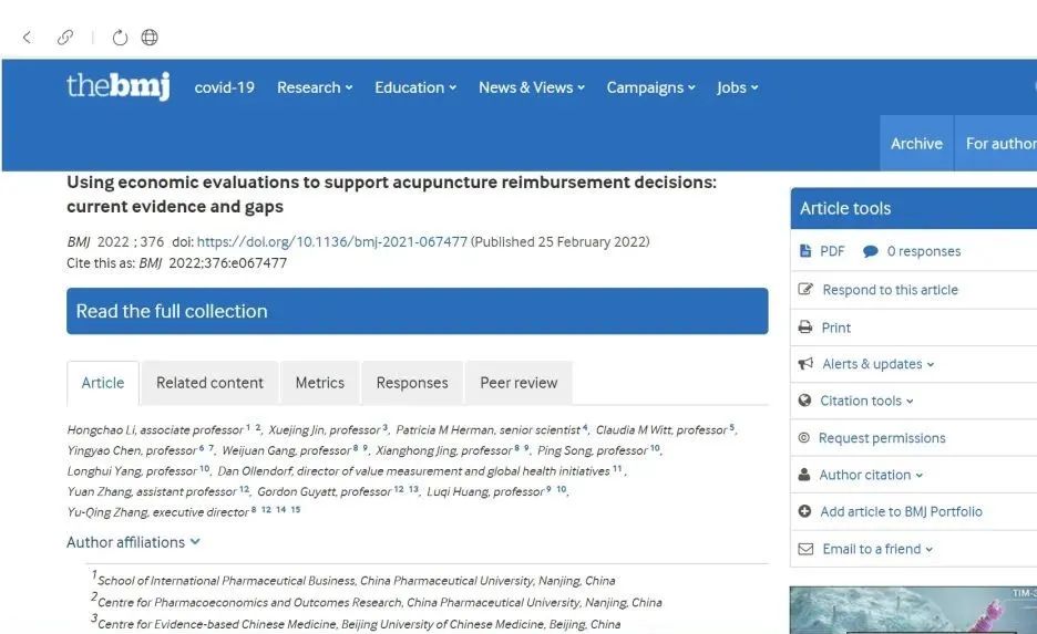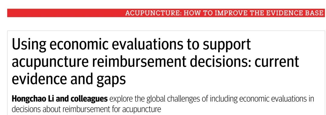 另一篇文章题为《使用卫生经济学评价支持针灸报销决策的现有证据和差距》(Using economic evaluations to support acupuncture reimbursement decisions: current evidence and gaps),由中国药科大学李洪超副教授和万象城allwincity官网循证医学中心金雪晶教授作为共同第一作者,汇集了来自中国药科大学、上海复旦大学、中国中医科学院、加拿大麦克马斯特大学、瑞士苏黎世大学、美国塔夫茨医疗中心、RAND公司的相关学者。