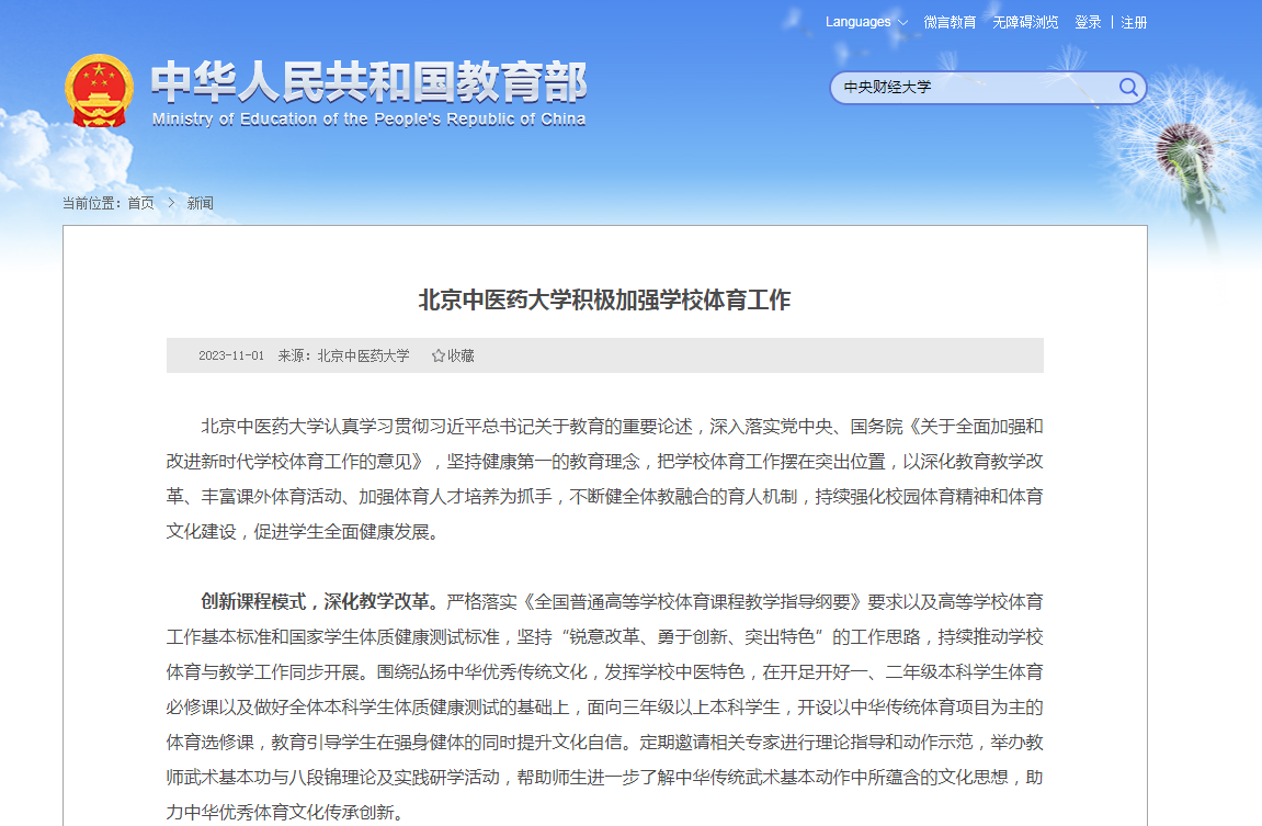 创新课程模式,深化教学改革。严格落实《全国普通高等学校体育课程教学指导纲要》要求以及高等学校体育工作基本标准和国家学生体质健康测试标准,坚持“锐意改革、勇于创新、突出特色”的工作思路,持续推动学校体育与教学工作同步开展。围绕弘扬中华优秀传统文化,发挥学校中医特色,在开足开好一、二年级本科学生体育必修课以及做好全体本科学生体质健康测试的基础上,面向三年级以上本科学生,开设以中华传统体育项目为主的体育选修课,教育引导学生在强身健体的同时提升文化自信。定期邀请相关专家进行理论指导和动作示范,举办教师武术基本功与八段锦理论及实践研学活动,帮助师生进一步了解中华传统武术基本动作中所蕴含的文化思想,助力中华优秀体育文化传承创新。
