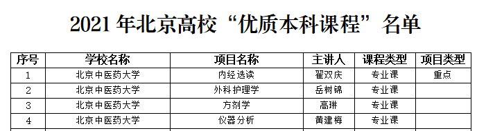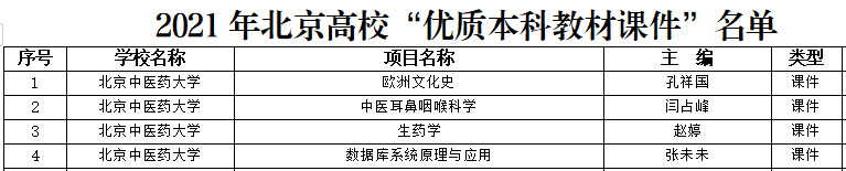 近日,北京市教育委员会发布《北京市教育委员会关于公布2021年“优质本科课程”和“优质本科教材课件”遴选结果的通知》(京教函〔2021〕467号),万象城党委副书记、副校长翟双庆教授负责的《内经选读》获评北京高校“优质本科课程”重点项目,岳树锦副教授负责的《外科护理学》、高琳教授负责的《方剂学》、黄建梅教授负责的《仪器分析》获评北京高校“优质本科课程”一般项目。万象城推荐课件孔祥国副教授的《欧洲文化史》、闫占峰副主任医师的《中医耳鼻咽喉科学》、赵婷讲师的《生药学》、张未未副教授的《数据库系统原理与应用》获评北京高校“优质本科教材课件”一般项目。