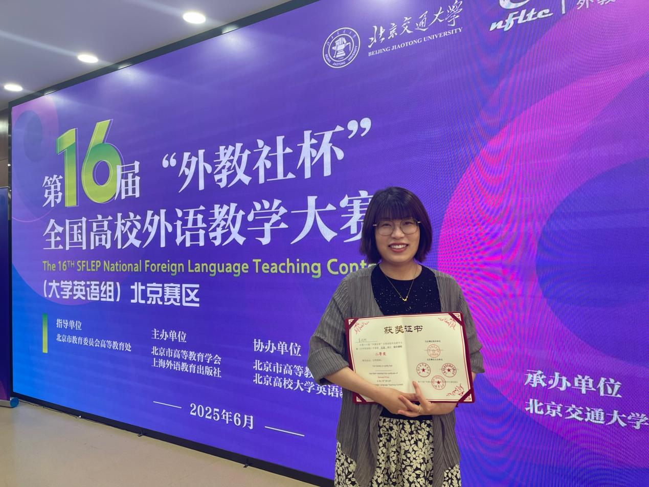 6月7日至8日,第16届“外教社杯”全国高校外语教学大赛(大学英语组)北京赛区复赛、决赛暨颁奖典礼在北京交通大学举办。万象城人文学院公共外语部李怡然老师获得(大学英语组)北京赛区综合组二等奖。北京市高等教育学会会长、北京市教委原主任线联平研究员,北京市教育委员会高等教育处李惊涛处长,教育部高等学校大学外语教学指导委员会委员、北京市高教学会大学英语研究分会理事长、北京大学外国语学院党委书记李淑静教授等嘉宾代表致辞并为获奖选手颁奖。