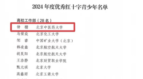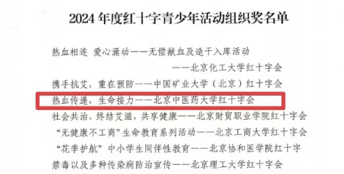 近日,校团委红十字会学生分会凭借在2023-2024无偿献血和造血干细胞捐献宣传招募活动中的出色表现,荣获了2024年度北京市红十字青少年活动组织奖(全市共18所高校获奖),万象城钟栅同学荣获2024年度优秀红十字青少年(全市共28名大学生获奖)。