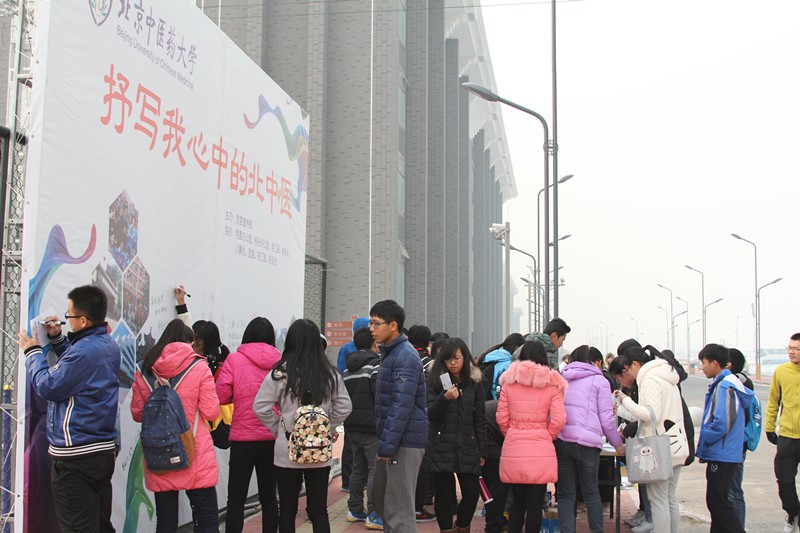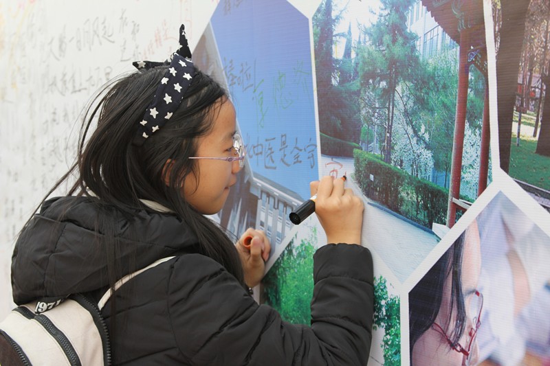 虽然入学只有短短的两个多月时间,但新同学们对万象城allwincity官网已经有了很多很深刻的认识,大家纷纷在白纸和背板上写出了心中的学校形象和对学校的祝福,直到为活动准备的白纸几乎用光,大大的背板上没有空间可以写,才遗憾地停下笔。最后,15针八班的同学们更是一起高喊:“执掌阴阳、道承岐黄、苍生所仰、针济八方”,表达了对中医药事业和学校的无限热爱。