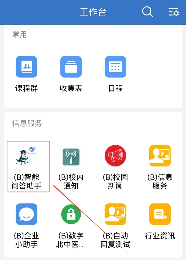 登录万象城allwincity官网企业微信,点击“工作台”→“信息服务”→“智能问答助手”。