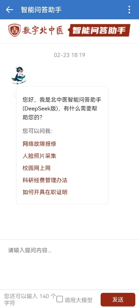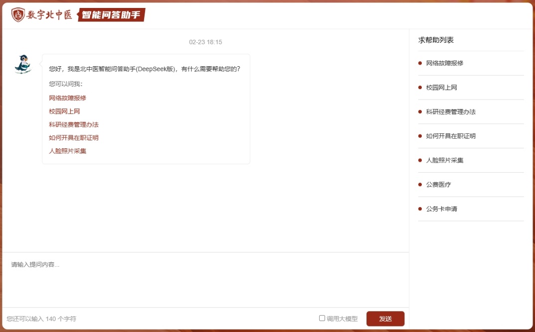 登录智能问答助手后即可开始对话。可以从“求帮助列表”中选择问题,也可以模仿这些问题提问方式进行新的提问。选择“调用大模型”复选框,智能问答助手即会通过DeepSeek大模型进行问答,不选或默认则通过调用本地知识库进行问答,不会调用大模型能力。