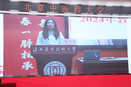 中医学院丁彤晶老师和滇西应用技术大学张雪飞老师分别代表学校新教师和对口支援单位新教师发言。她们表示作为教师,深感责任重大,将积极肩负起弘扬中医药精神、传承中医药文化的使命,为中医药事业的传承、创新与发展贡献力量。