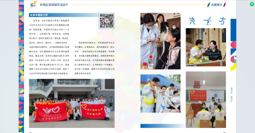 同时,校团委主办的“中医药文化润心行动——五进计划”被赛事官方宣传册“共建展示”专栏选录,面向全区各委办局、各街道、各社区、各领域人群进行展示宣传。