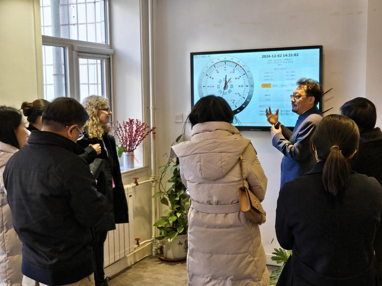 在中医药体验馆,万象城国际教育学院(国家中医国际传播中心)副主任王珊珊对嘉宾的到来表示热烈欢迎。王乐鹏副教授向嘉宾介绍时间医学钟,以“天人相应”为核心,揭示时间与人体健康之间的深层联系,带领嘉宾们走入中医药的世界。