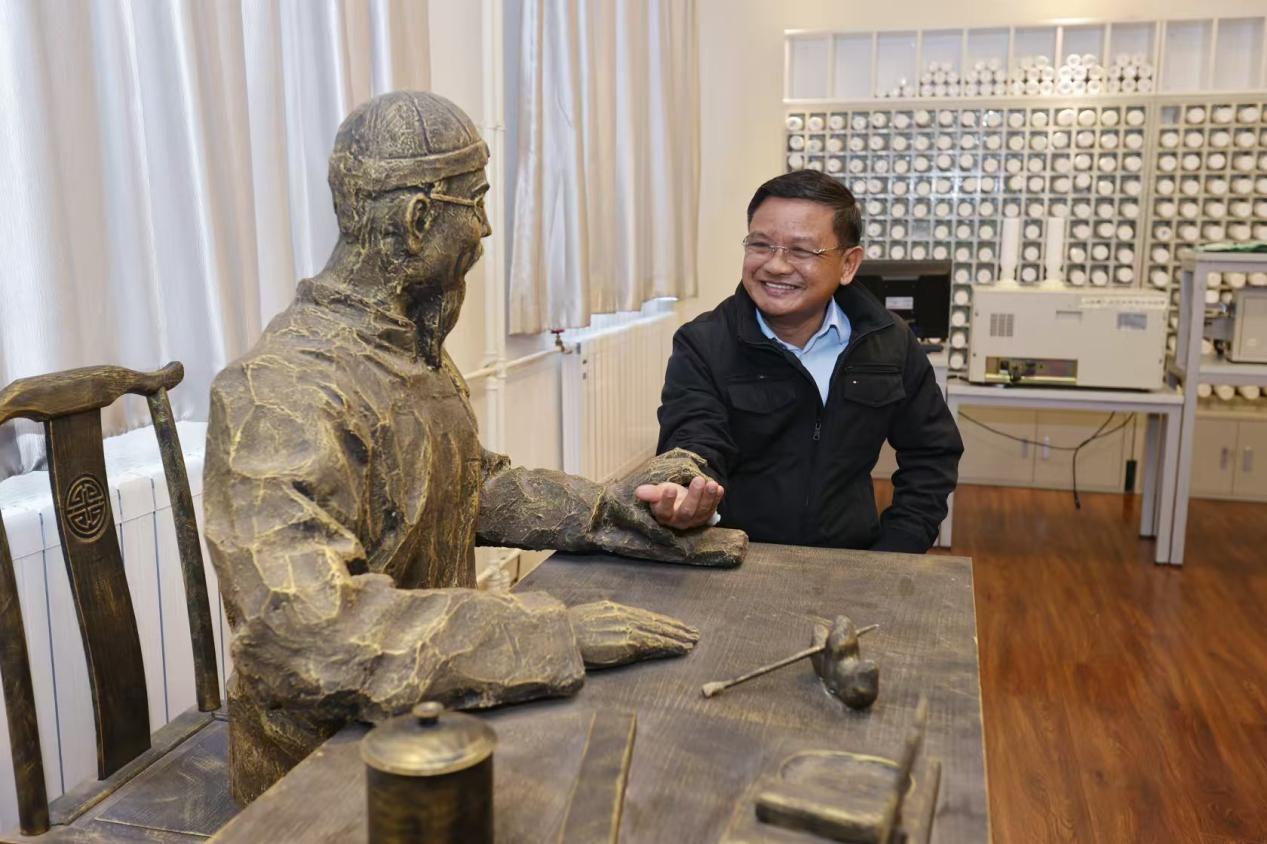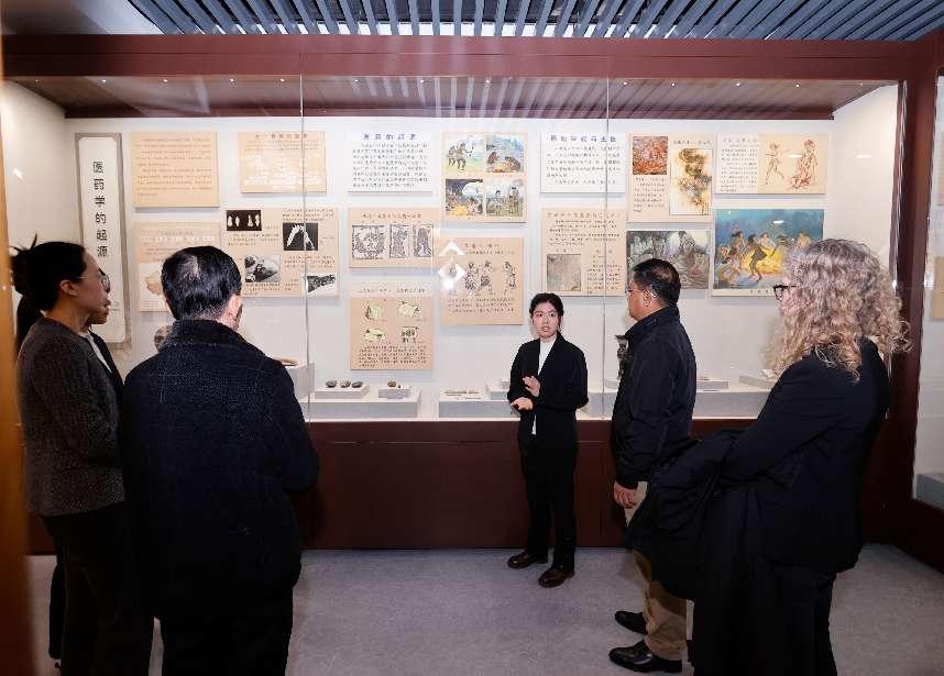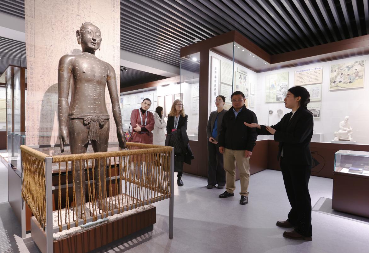 在中医药博物馆的中国医学史展厅,嘉宾在讲解员的带领下领略中医药发展的源远流长,对龟板上的甲骨文、长沙马王堆的导引图、芳香药物、孙思邈的坐虎针龙和养生方法、针灸铜人以及清代的圆药柜、老药铺等都表现出极大兴趣。
