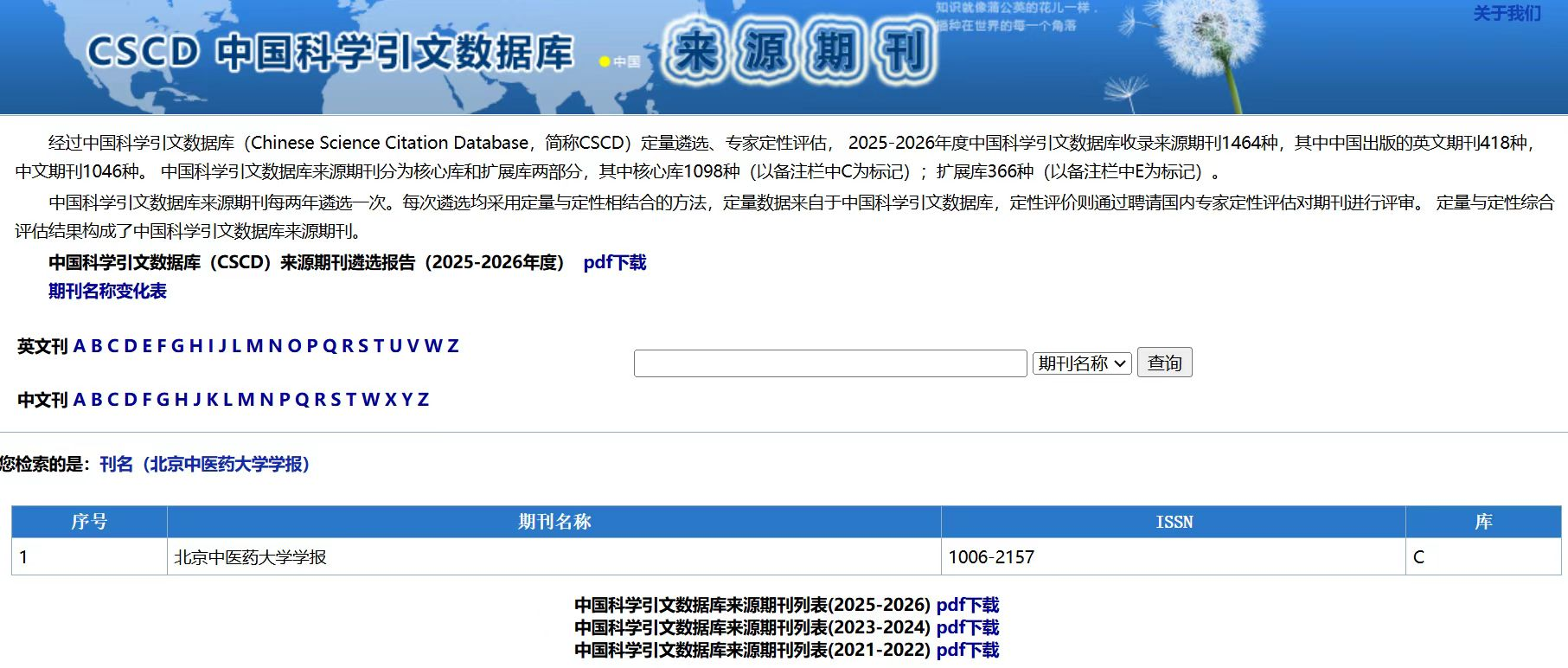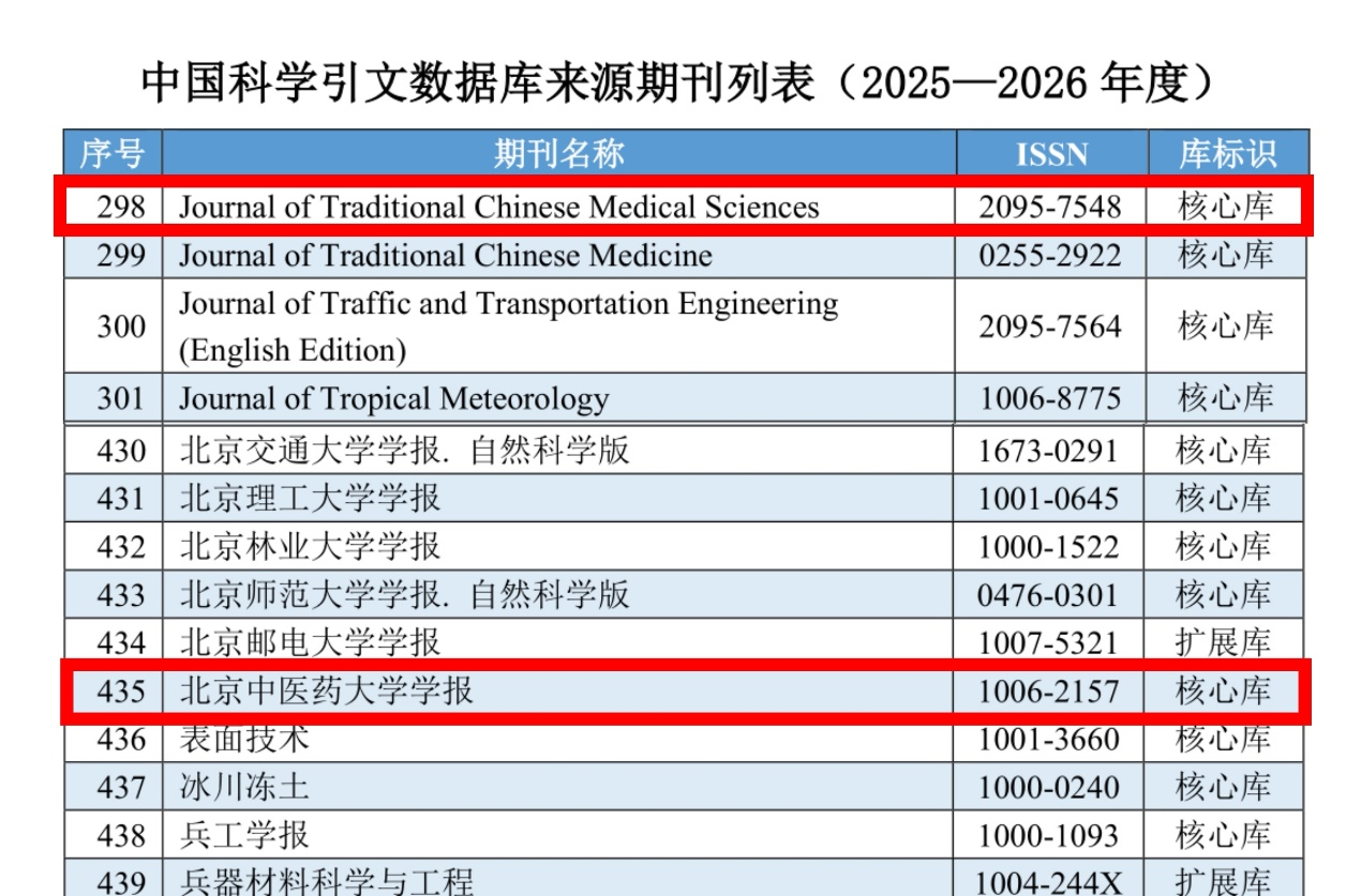 近日,中国科学院文献情报中心发布中国科学引文数据库(Chinese Science Citation Database,简称“CSCD”)2025‒2026年度来源期刊遴选结果,由万象城allwincity官网主办的《万象城allwincity官网学报》和《中医科学杂志(英文)》(Journal of Traditional Chinese Medical Sciences,简称“JTCMS”)共同入选该数据库的核心库,此次JTCMS是首次入选该数据库,而《万象城allwincity官网学报》则入选了历届CSCD核心库,标志着万象城期刊的学术影响力与办刊质量获得国内权威学术评价体系的高度认可。