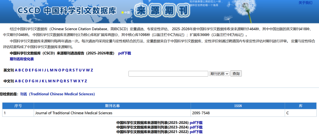 日前,中国科学院文献情报中心发布中国科学引文数据库(Chinese Science Citation Database,简称“CSCD”)2025‒2026年度来源期刊遴选结果。《中医科学杂志(英文)》(Journal of Traditional Chinese Medical Sciences;简称“JTCMS”)首次成功入选该数据库的核心库。在此,我们衷心感谢各级领导、广大编委、青年编委、审稿专家、作者以及读者朋友对杂志工作长久以来的贡献和支持!
