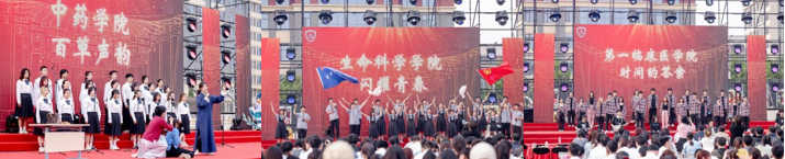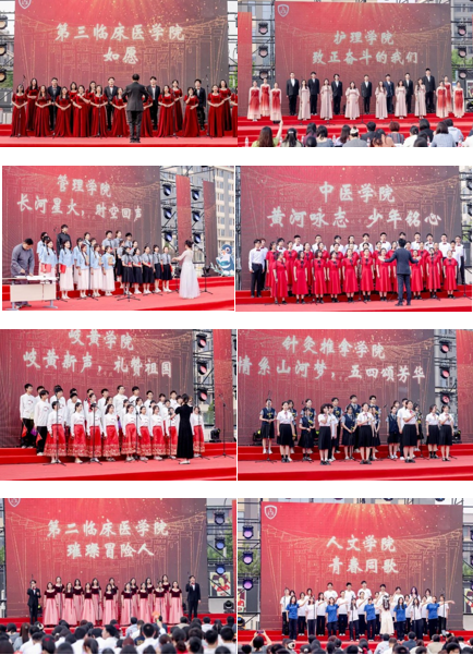 各学院按顺序依次登场进行学院风采展示。第三临床医学院《如愿》,护理学院《致正奋斗的我们》,管理学院《长河星火,时空回声》,中医学院《黄河咏志,少年铭心》,岐黄学院《岐黄新声,礼赞祖国》,针灸推拿学院《情系山河梦,五四颂芳华》,第二临床医学院《璀璨冒险人》,人文学院《青春同歌》,中药学院《百草声韵》,生命科学学院《闪耀青春》,第一临床医学院《时间的答案》,每个节目都是婉转歌声与真挚情感的交织,诉说着青年传承先辈之志、勇担家国重任的坚定决心。部分节目中,学院领导与青年教师们与同学们一同登台,唱响五四精神传承与党团育人的最强音,引起现场阵阵欢呼与掌声。