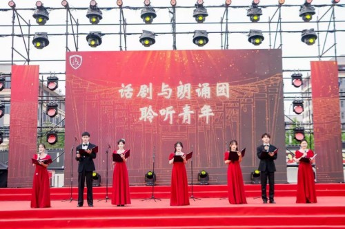 校大学生艺术团话剧与朗诵团深情演绎诗朗诵《聆听青年》,以激昂的话语拉开了五四歌会的序幕。